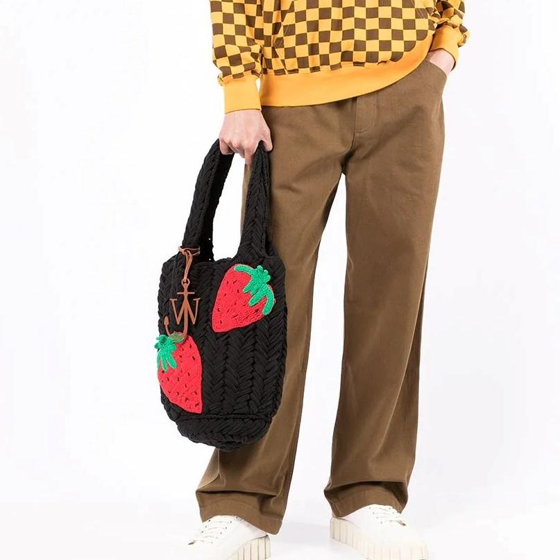 - JW Anderson 草莓图案钩编针织托特包 设计细节:黑色、标志性 JW 船锚 logo、钩编设计、标志性草莓图案、平顶手柄、开放式包口、主夹层。