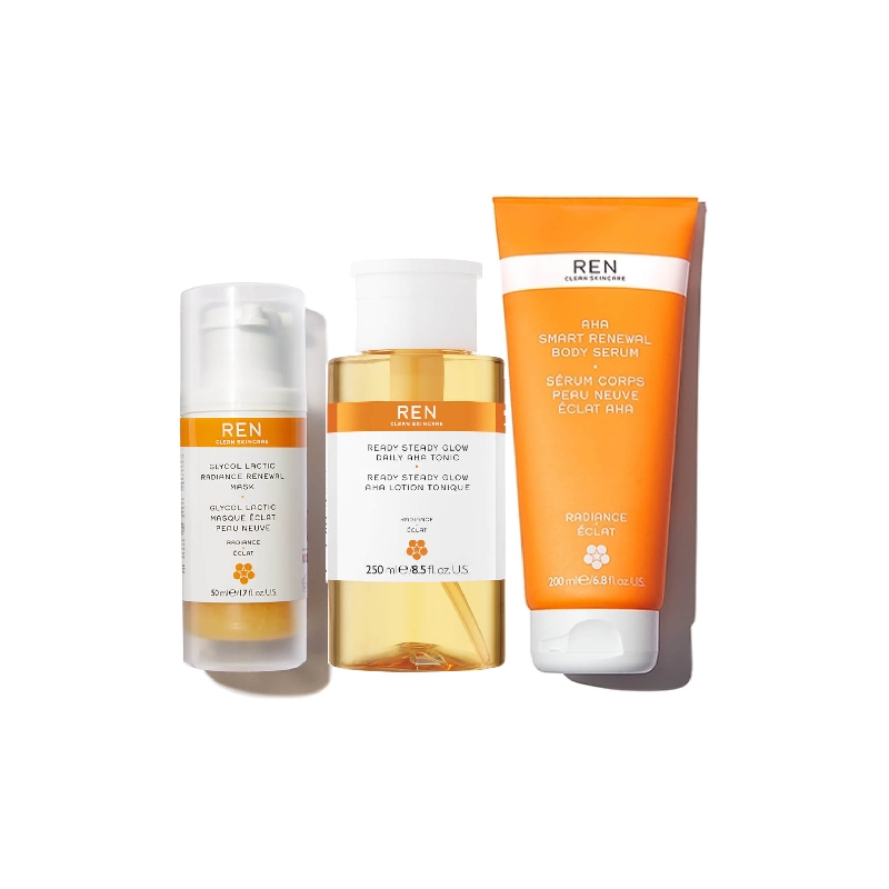- REN芢果酸换肤系列套装包括:身体乳200ml,毛孔收敛水250ml,面膜50ml。果酸换肤系列温和祛角质,主打酵母发酵果酸,有效去角质,消除死皮,促进细胞更新,益生菌提取物增强皮肤屏障,加上提取自树皮的木糖醇优化皮肤水分循环,建立耐受之后皮肤越来越水润,闭口见效较快,敏感肌也适用哦。