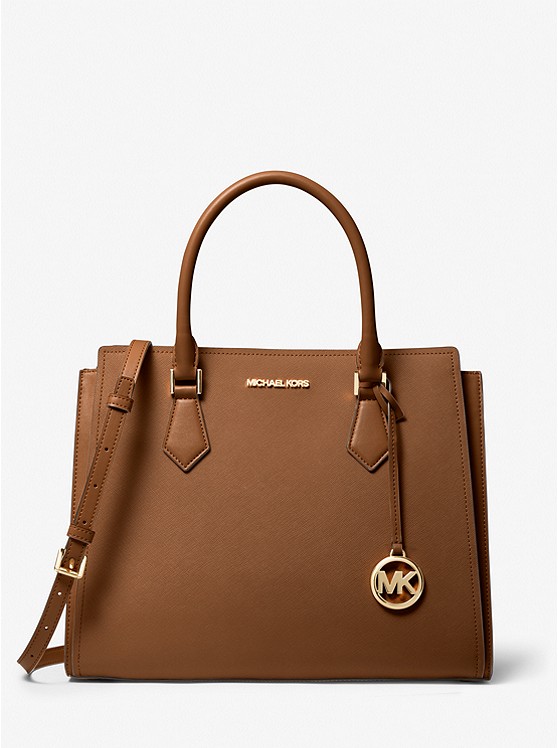 - MK 这款包包由Saffiano皮革和镀金五金制成,正面和背面的口袋增大利用空间,包包内部空间足够大,平板电脑或书籍都能放下哦!
