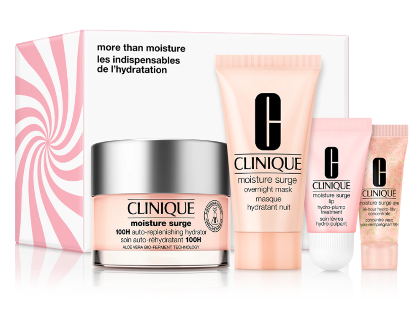 - 深受喜爱的 Moisture Surge™ 郁郁葱葱的皮肤淬火套装来咯。主打四种无油配方,还您柔软、水润的肌肤。Moisture Surge™ 100H 自动补水保湿器可不间断工作 100 小时 - 即使在洗脸后也是如此。Moisture Surge™ 隔夜面膜在夜间为您提供滋养,让您醒来时肌肤水润。Moisture Surge Eye™ 96 小时Hydro-Filler Concentrate 可立即重新充盈并紧致肌肤。Moisture Surge™ Lip Hydro-Plump Treatment 为柔软的双唇提供丰盈的水分和营养,抚平和准备唇部化妆。