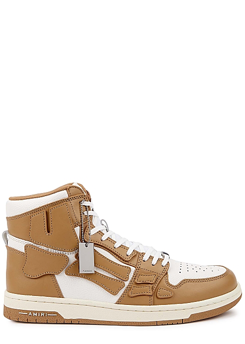 - Amari 驼色和白色皮革高帮运动鞋 侧边镂空贴花,镶板加垫脚踝,银色设计师吊牌和饰牌,穿孔细节,鞋舌饰有设计师印章,可拆卸驼色磨砂饰边,驼色和米白色橡胶鞋底,圆头
