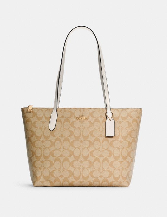 - 这款COACH 蔻驰 Zip 女款真皮老花托特包,采用真皮材质,造型设计为经典的tote包造型,简单又不失时尚。正面有烫金品牌logo,有品牌挂饰,包口拉链开合,是一款不错的日常通勤包。