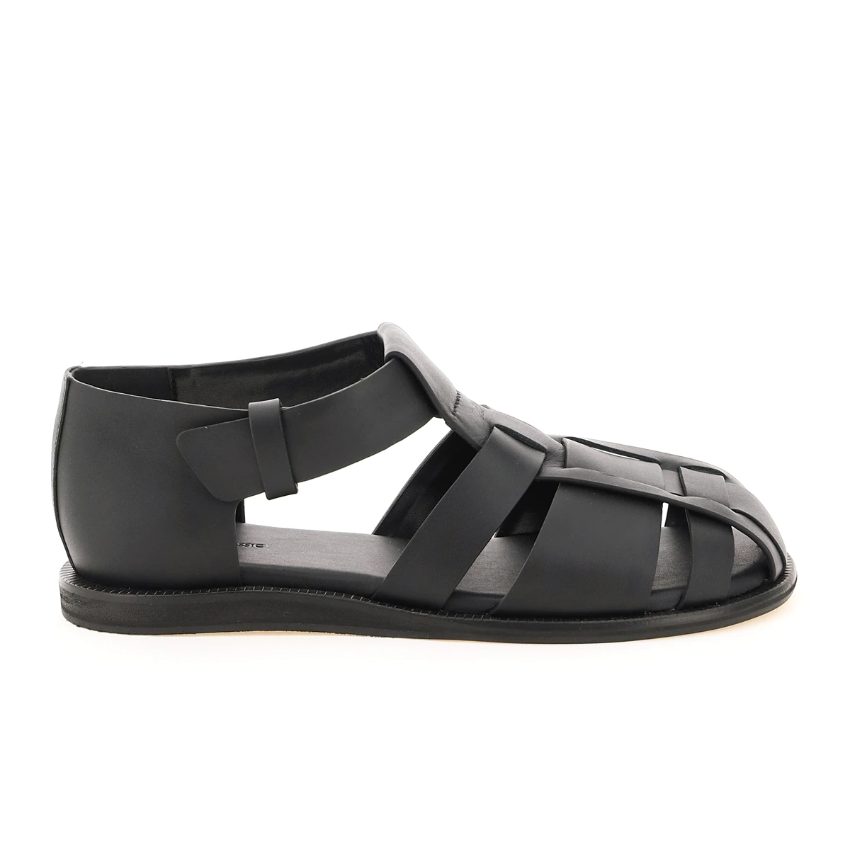 - The Row的渔夫凉鞋名字恰如其分——它们的编织笼带巧妙地参考了航海网。它们采用纯黑色,采用粒面小牛皮制成,配有搭扣带子,确保合脚,凸起的橡胶鞋底能确保每一步都舒适。超级火的鞋终于补货了,手慢无!!!