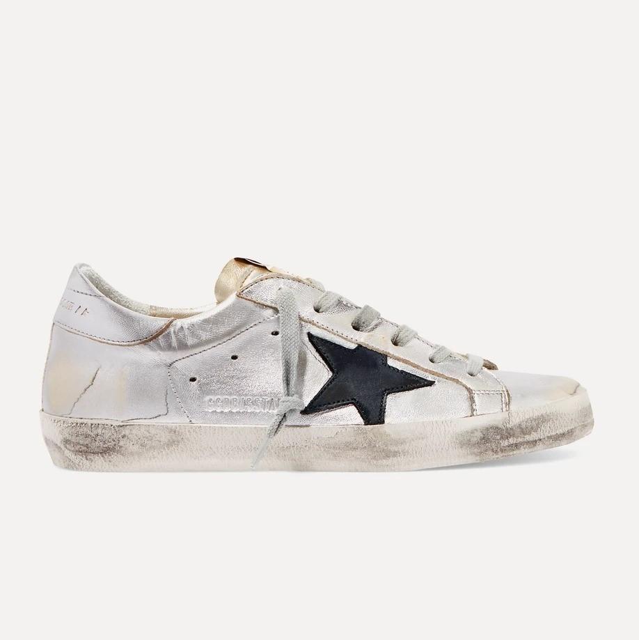 - Golden Goose 这款 “Superstar” 皮革运动鞋在 2019 秋冬季再度升级,披上闪亮的银色和浅金双色“新衣”。此单品由威尼斯巧匠精心制成,醒目的黑色星形贴花别具辨识度;鞋面和鞋底均经巧妙做旧处理,仿若滑板手征战四方后留下的印记,尽显品牌特色酷感。