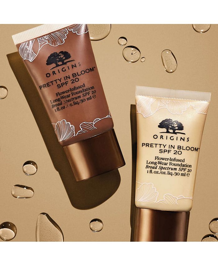 - Origins 悦木之源推出全新的24小时持妆粉底Pretty In Bloom。这是一款花香型持妆粉底液,全30种色调,带有SPF20的防晒值,采用了12种花卉的滋养成分混合制作,添加了纯正的花瓣精华,花蜜以及芳香油,能够24小时呵护肌肤,提供柔滑轻盈的覆盖效果,自然如同花瓣一般娇柔美好的肌肤。可以适用于所有的肤质。