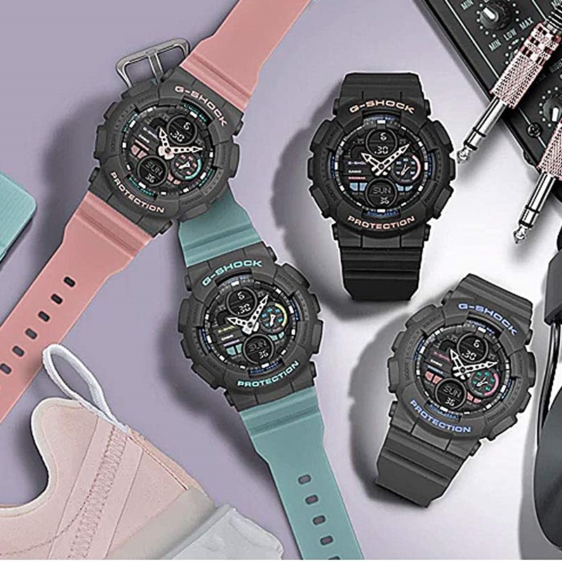 - 卡西欧GMA-S140为GA-140的缩小版,灵感来源于当下十分流行的“老爹鞋”,将其丰富的层次感融入表款中,复古风格不灭,为女性们再次掀起时尚的新风潮~ 除了潮流百搭的黑蓝色,另两款使用了柔和的低饱和度配色表带,超级适合做情侣款。