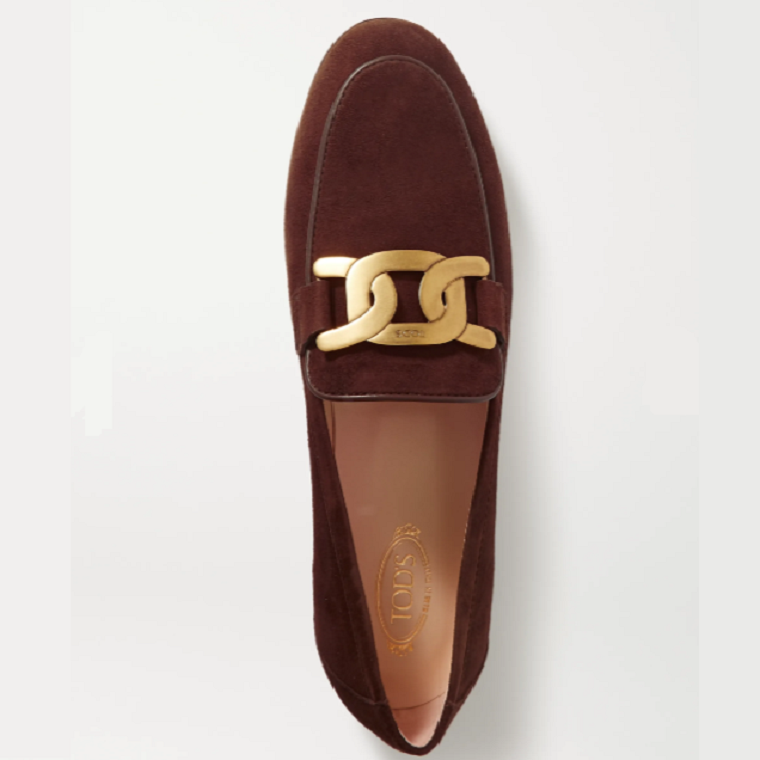 - Tod's 这款 “Catena” 乐福鞋以触感颇佳的绒面革于意大利精心制成,采用超低跟设计,鞋面上还饰有超大号金色交扣链饰。不妨搭配直筒牛仔裤与纯棉衬衫,打造时髦休闲造型。