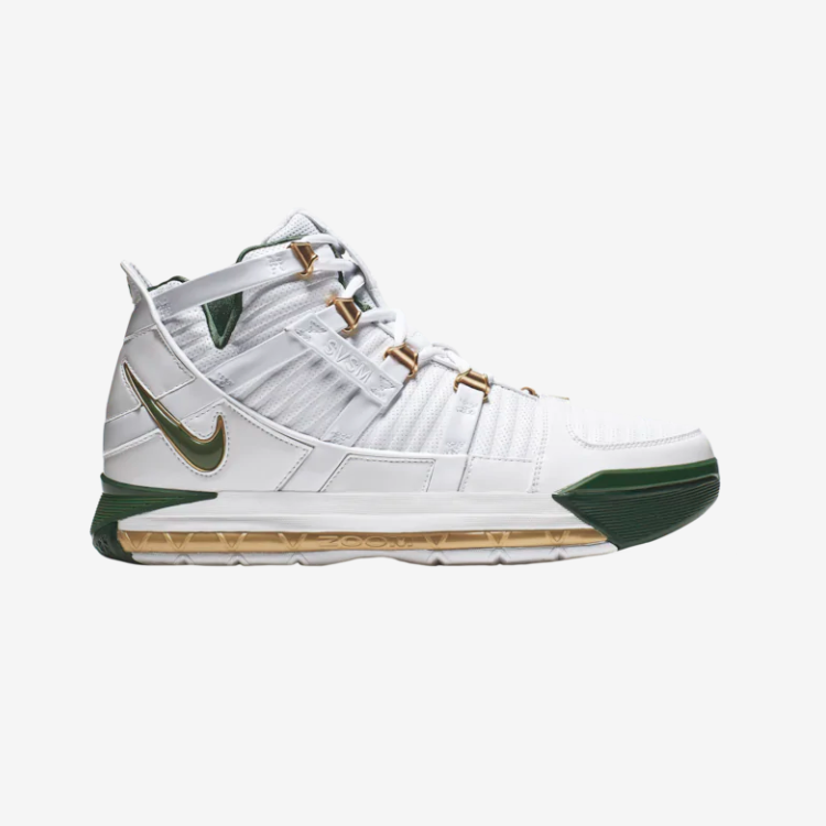 - Nike Zoom LeBron 3 鞋面采用笼式结构,由皮革打造而成,虽然鞋身重量较重,却为詹姆斯野兽级身体提供了强力保护;中底沿用了前代的 Zoom Air 和 Pebax 的外包处理,也应詹姆斯的个人需求将 Zoom Air 做薄,以提供大体重下更好的力回馈作用。
