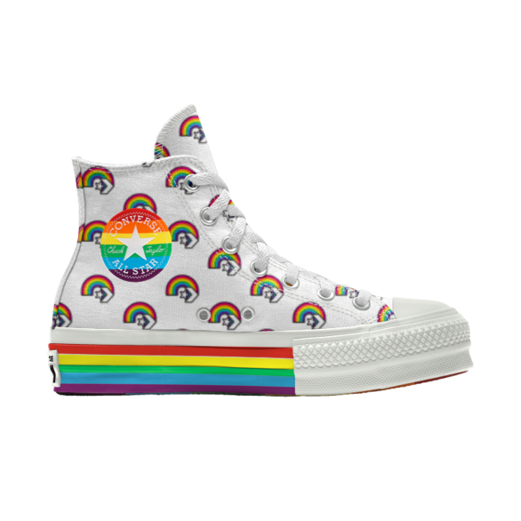 - Converse 匡威 All Star 这款彩虹高帮鞋采用了经典的高帮鞋型,加上耐穿的橡胶鞋底,厚底设计能够显腿长增高哦,鞋面上铺设了可爱的小小的彩虹图案,特别俏皮有趣哦,侧面还有彩虹渐变的星星 logo,鞋底侧面也是彩虹渐变的设计,出彩又很吸睛哦。
