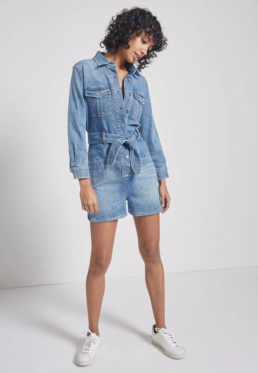 - 这件连体短裤由中等重量的牛仔布制成,略带弹性,最大的惊喜之处就是束腰!即使是休闲挺阔的牛仔布料也能轻松打造出纤细的腰身。搭配凉鞋或踝靴,一起度过休闲朋克的 weekend 吧~