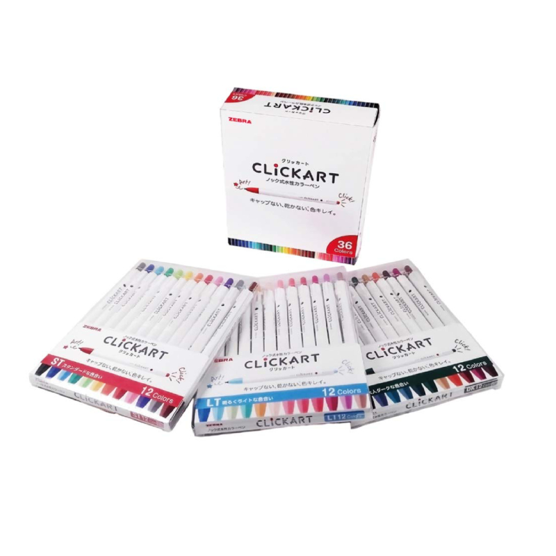 - 这款 ZEBRA 斑马 CLICKART 防晕染按动式36色水彩笔,采用特殊的纤维笔头搭配防干墨水,即使再空气中一段时间也能出水,这款为36色大套装,内含12色3小包装,分为 ST 标准色12支,LT浅色12支,DK深色12支,基本可以满足日常生活的颜色需求。
